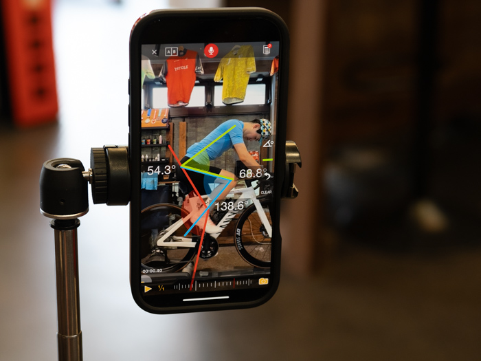 まずは実際にローラー上で走行している姿を横から動画撮影し、にっしーさんがアプリで角度を記入していきます。