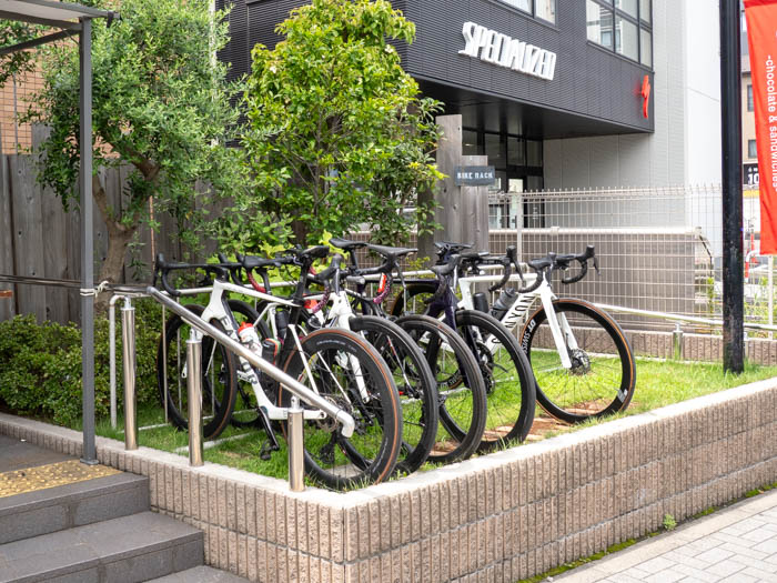 店舗前にも通常のサイクルラックがありますが、1段上がったところにもサイクルラックあります。