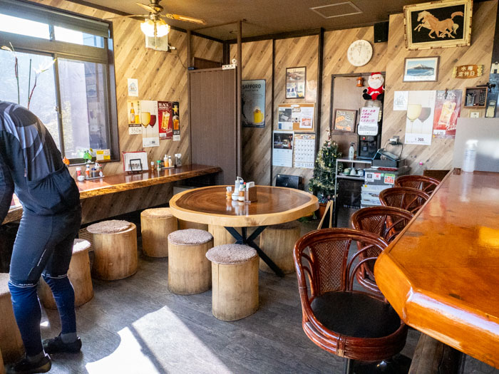 おしゃれな店内には切り株の椅子が並べられていて、カウンタースペースでの1人飯も問題なさそうですね。