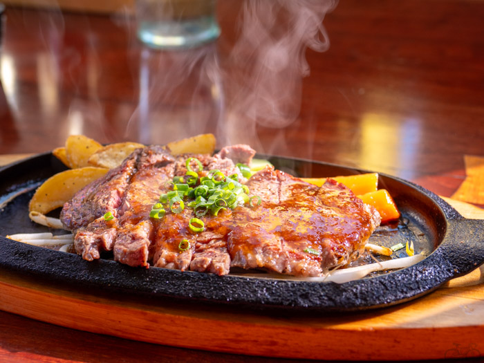 そしてお待ちかねのステーキ!分厚すぎず、鉄板に乗ってアチアチの状態で提供されます。