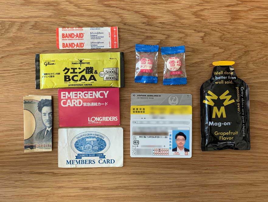 通常、ライドになると身分証のIDにカード類、緊急連絡先のエマージェンシーカードに現金。