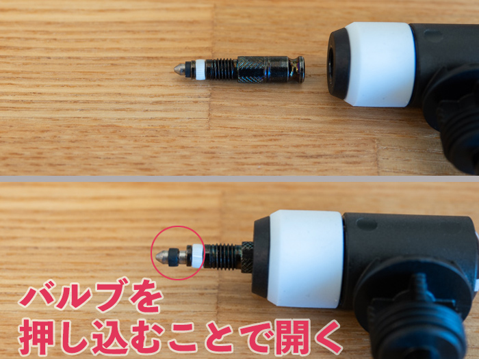 これが、ポンプヘッドを差し込むだけで簡単に空気が入れられるようになる仕組みです。