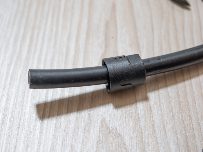 ヒラメポンプヘッドを取り外したホースに輪型の固定具を通します。