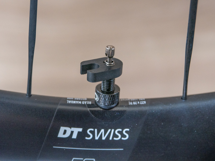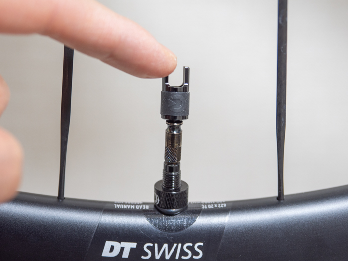 まずは付属のバルブコアツールの穴が空いている方を利用して、フレンチバルブを外していきます。